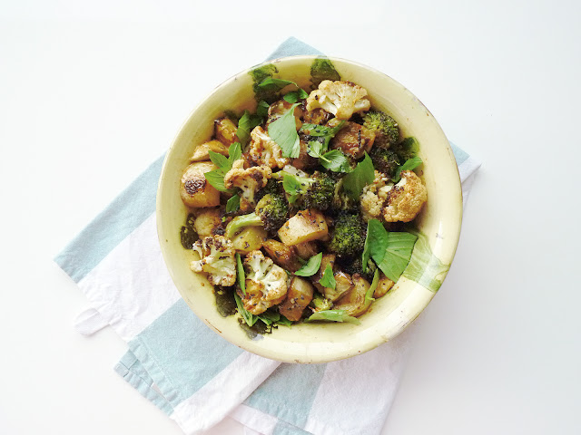 normally, with curry paste you just make a curry. end of story. but since it's a flavorful spice-mix, and very versatile, actually, i thought why not use it for a vegetable marinade? plus: i love one-bowl-dishes.... so simple, yet this is so surprisingly different. the roasting renders the vegs nutty (but nice, chuckle). after i roasted the cauliflower, broccoli, aubergine and potatoes in the oven, i added a bit of coconut milk in the end, sprinkled some chopped thai basil on top, and voilà, you're done!