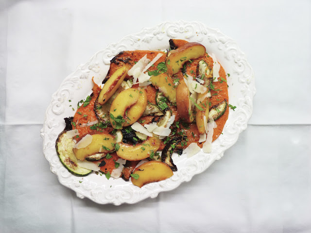 the transition from summer into fall is something that makes me so homey-feeling... though it's got a twist: on the one side, you try to squeeze the most potential out of the summer finale and enjoy every second of sunshine and warmth - on the other side i already embrace the colder weather and the fog (frequent in zurich) and any possibility to weark heavy knit sweaters (and socks, and blankets, for that matter)! a dish that combines both, summer and fall? well, summery peaches and autumnal pumpkins make a great love affair, really. grill everything (another summer tradition), add a hint of truffle and mint, sprinkle with some salty, strong pecorino... and you've got september on a platter!