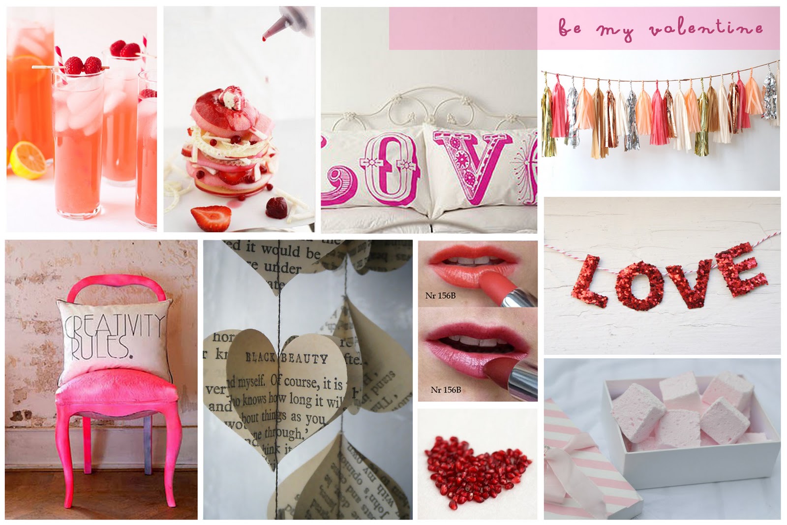 here is a bit of inspiration for the upcoming valentine's day, including some recipe ideas and DIY inspiration. valentine's is the perfect day to sport cheeky red lips. you might want to surprise your loved one with a heart-shaped newspaper garland that you did on your own, a glittery message on the wall or a whimsy tassels garland to hang above your dinner table. create an atmosphere of love with pink accents, like the love-letter cushions, or the pink tinted chair. and why not try a raspberry lemonade and a crunchy apple fennel salad for a romantic candle lit dinner à deux? plus maybe some spongy pale pink marshmallows to nibble on and feed each other?