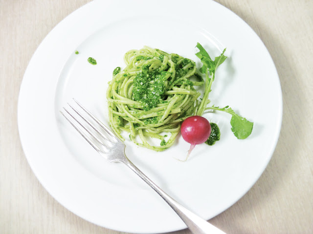 doesn't this look quite pretty? well. i certainly think it does. the green color is stunning, and pops even more next to the clashing, deep red of the radish. the arugula certainly results in a nice green colored pesto - but otherwise... well, let's just say arugula is not meant to be a pesto. whatsoever. and the handful of green peas didn't help much. it was a very bitter experience (literally). not much taste, other than the very strong bitterness. this recipe clearly didn't pass my BIMH taste buds' check.