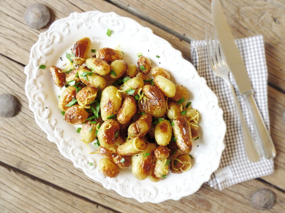 preheat the oven to 220 degrees. place a parchment paper on the baking sheet, and spread the potatoes on it evenly. pour the olive oil over them, add the garlic, a generous pinch of salt and the cumin seeds. toss everything. roast in the oven for about 30 minutes (you might have to stir a few times). arrange the potatoes on a plate. chop the chives or wild garlic greens, peel the orange zests and squeeze the lemon. add everything on top of the potatoes. enjoy immediately.