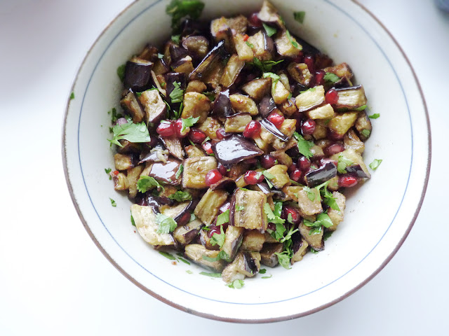 preheat the oven (with the grill function on) to 220 degrees. line a baking sheet with parchment paper. wash the eggplants and slice into equally sized cubes. spread on the baking sheet, and drizzle with some olive oil. add the garlic, 2 generous pinches of fleur de sel, cumin and curry and toss. roast for 20 minutes or until the cubes are slightly dry looking and golden brown. take out and put aside to cool. in the meantime, combine the lemon juice, peperoncino and a bit more oil. place the eggplants in a bowl and pour the dressing over. add the herbs and pomegranate seeds and combine. season with some more fleur de sel and another sprinkle of olive oil, if needed. serve tepid.