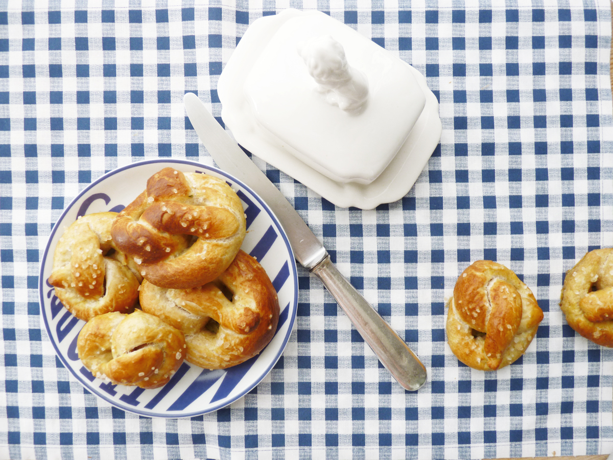 that's why i wanted to make my own soft pretzels, because, for starts, they're soft (surprise!). and in addition i could make them even softer (by not baking them as long etc.). they turned out to be a big success. sure, some of the pretzels turned out looking rather... not pretzel-like at all. more like snails. or ugly piles of dough (not naming the exact connotation you might have had with them...). but: don't be deceived! this is fun to make, easy (apart from the shaping, it requires patience) and oh my, so good. eat them fresh out of the oven, with some good butter smeared on top. and maybe a potatoe salad, because that's how the bavarians would enjoy it. or an obatzda cheese mix. or simply a salted radi. preferrably in a dirndl. but okay, i agree that that's a whole other story...