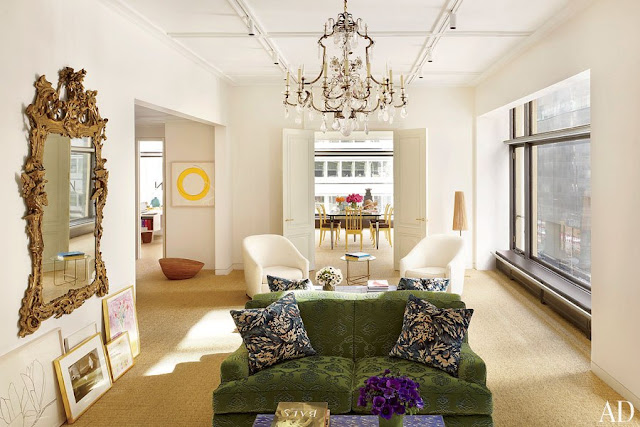 this picture makes me happy, in so many ways. it's a glimpse into aerin lauder's glamorous manhattan loft (read more here). i would love to live in this picture. can't really decide why, but it may be due to the jewel green settee, combined with the doubled up sitting area in the back. and of course the overall french chic. uhm, what's not to like, really.