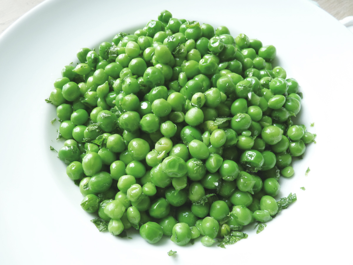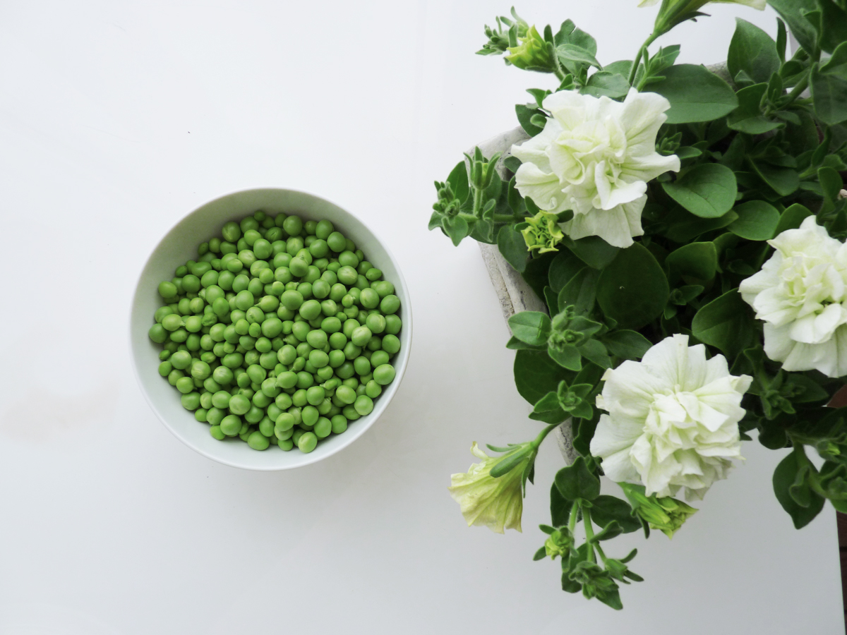 heat a saucepan of salted water, and prepare a bucket full of ice water. blanch the peas in the salted water for 3-4 minutes. remember: the frozen peas that you normally get at the supermarket are mostly already pre blanched! so the cooking process takes longer for fresh, raw peas. strain, and put immediately in the ice water to cool. the ice water helps the peas to keep their popping green. make a dressing out of the lemon juice, olive oil, fleur de sel and garlic cloves. combine with the peas.