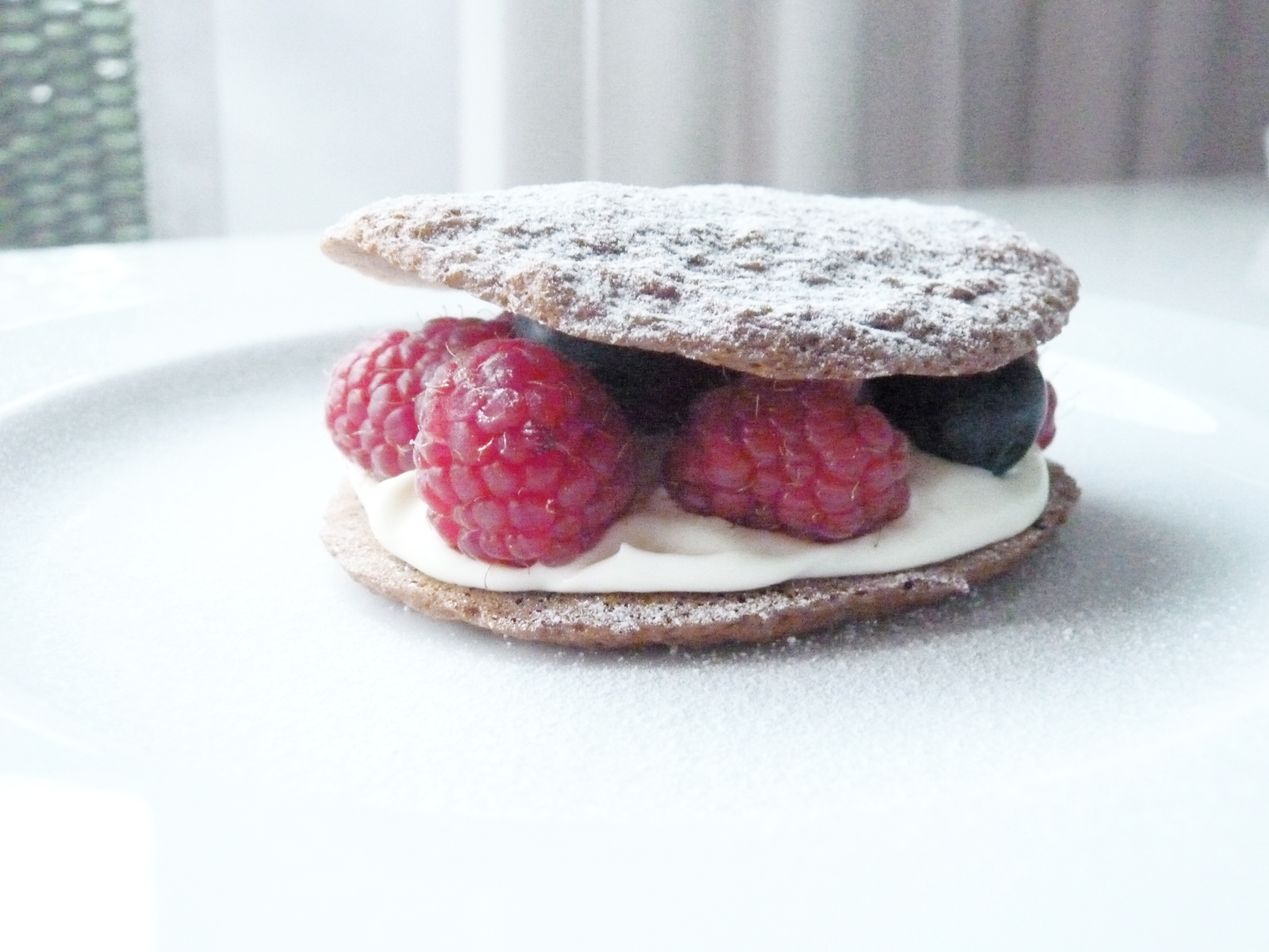 shape little pools of dough on the baking sheet (we used a pipe, though the batter was a little too liquid, we admit, so the pipe wasn't really useful, cough. a spoon would do, we're pretty sure). bake in the oven for 8-10 minutes. let cool entirely before removing. assemble the maccarons: spread a little double crème on the bottom part, add a few berries, cover with the lid part, dust with a bit of confectioner's sugar. voilà. serve and enjoy.