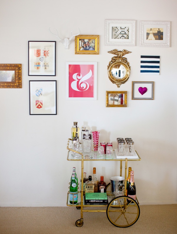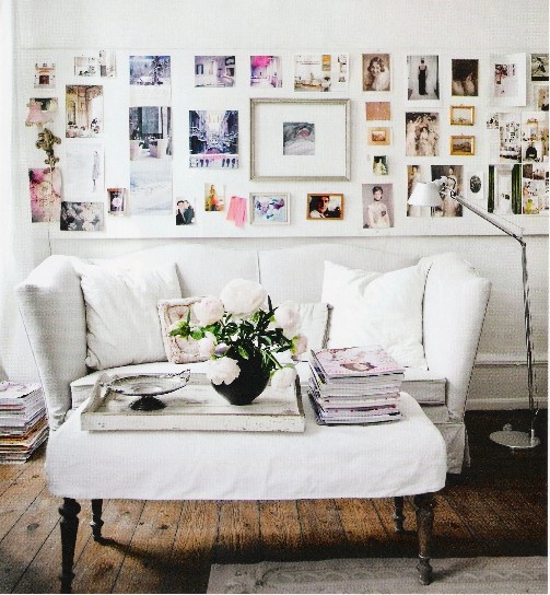 i collected and thoroughly selected the right mood pictures for you of how this wall of fame should look. the first picture is of quite a small collection of pictures, but i like the color and pattern mix. cheerful and unusual (of course, i love the bar cart as well, you know that much already). the second picture attracts me because the display is so vast and generous, and a little messy, too: some pics are sticked to the wall without even so much as a proper frame, but i believe this accounts for all of the gallery's charm!