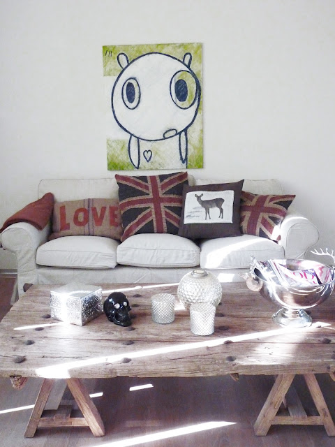 the best thing is that now i've got so much more space in the living room area! you can't see that above (and i'm afraid the picture isn't really so good, i was a bit impatient while taking it... sorry). the space feels really good. it's finally breathing! and with this new-found space i am planning on buying a second sofa, or a settee, and maybe one or two easy chairs, too. plus, i really need a new floor lamp. i'm thinking maybe one with an oversized white textile shade? and possibly some new pillows (what do you think of pink, or bottle green, or black and white striped?).