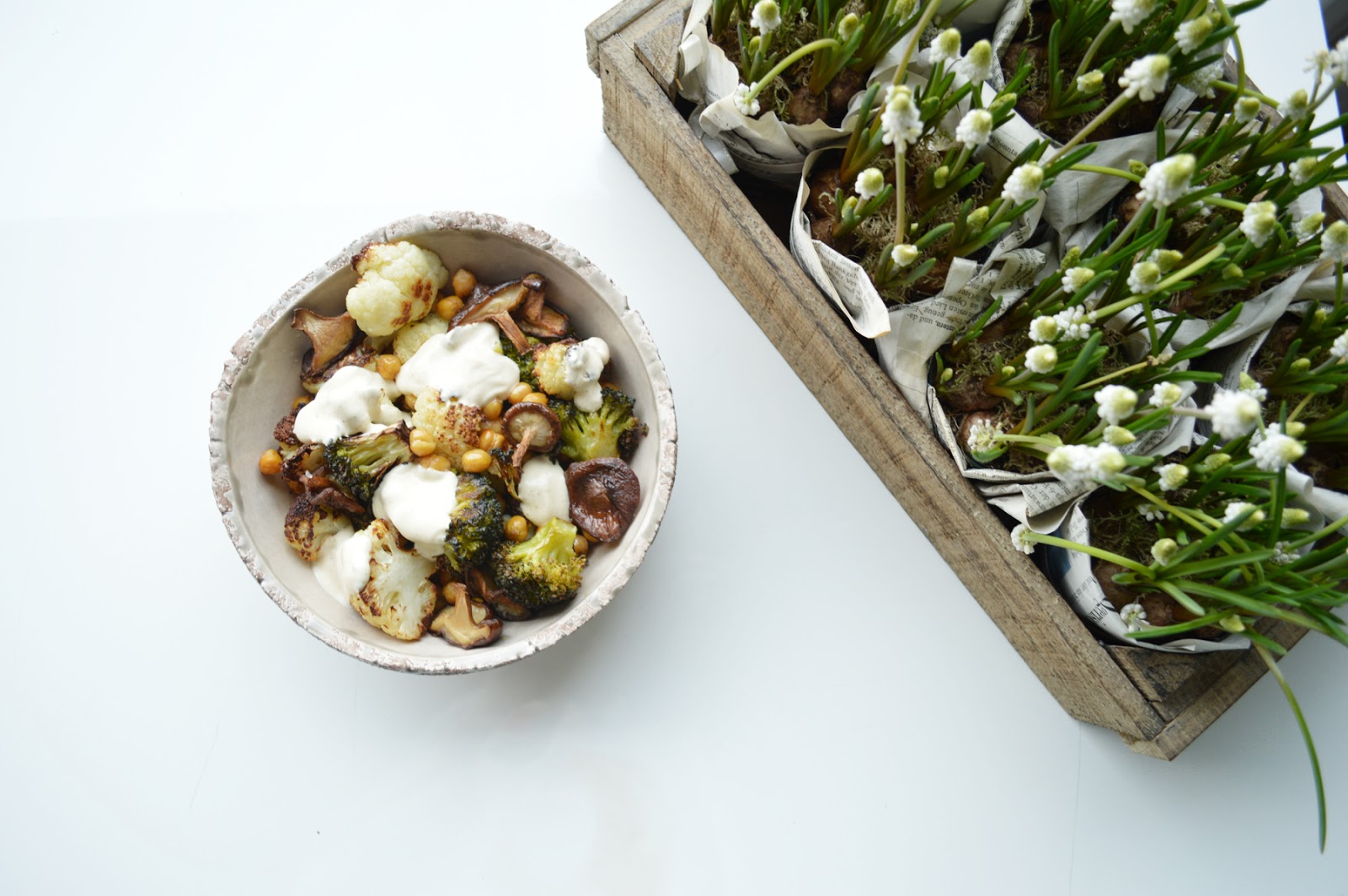 preheat the oven to 220 degrees c / 380 degrees f, and line a baking sheet with parchment paper (yes, all good things start with those two steps). spread the broccoli, cauliflower and chickpeas onto the sheet. drizzle with olive oil and sprinkle with maldon sea salt, quite liberally. roast for 25 minutes. in the meantime, whip up the yogurt sauce with the curry paste, tahini and harissa (i know it's a fun mix, but it's still worth giving a try). i find you don't need a lot of salt for the yogurt, but season according to your taste. let the vegs cool a bit before ladling into a bowl. add a few dollops of yogurt. serve warm (i.e., in this case, eat alone, in front of telly, and think you're sooo lucky to have this bowl-ful of goodness... in fact, you might almost get a bit sentimental and religious... or you could call it esoteric, ahem. but let's not push it too far... a good bowlful of good food is enough to make me happy, i don't need buddha - just now. thank you anyway...).