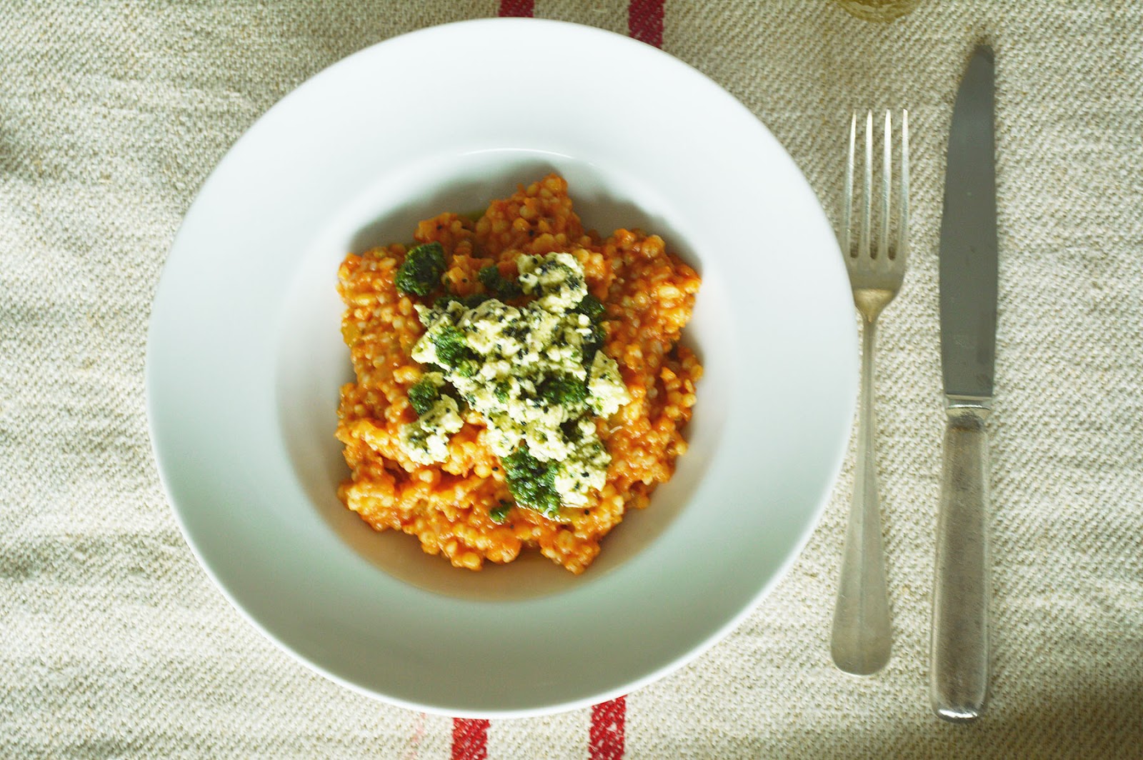 this genius barley risotto with marinated feta is yet another ottolenghi invention (from his latest cookbook 'jerusalem'). it's strangely italian, but the feta and spices give it a nice middle eastern twist, too.