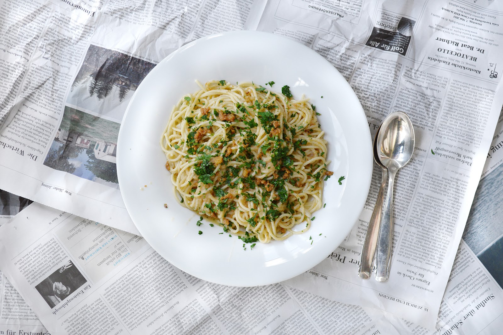 add 2 tbsp of olive oil to drained pasta along with half of lemon juice and combine. add an appropriate amount of pasta water to the pasta, too, to keep it moist. combine parsley with breadcrumbs and mix most of it with pasta; keeping some to garnish the plate with. serve pasta with the rest of breadcrumbs and parsley nicely arranged on top. a side of 'caramelized fennel' or any other green contorno is fabulous to go with this.