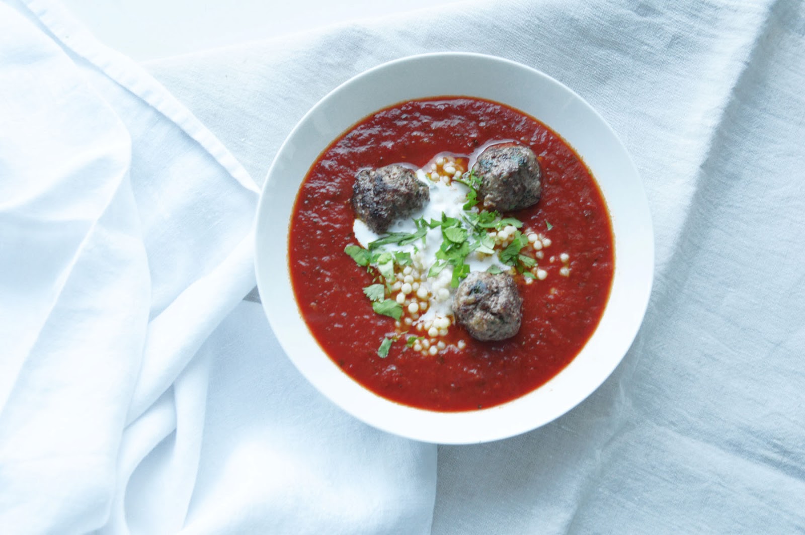 tomato soup with meatballs & pearl couscous