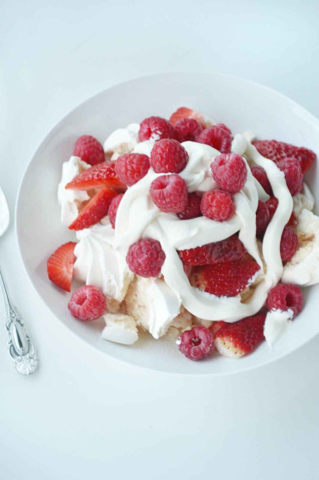 do you know what eton mess is? it's mainly a mess, but then, all good things have chaos in them. just take some meringues, crush them roughly, cover (get dirty) with whipped or double cream (i prefer double cream... i'm naughty) and berries and gobble it up before it's soaked too much. create a mess, love it.