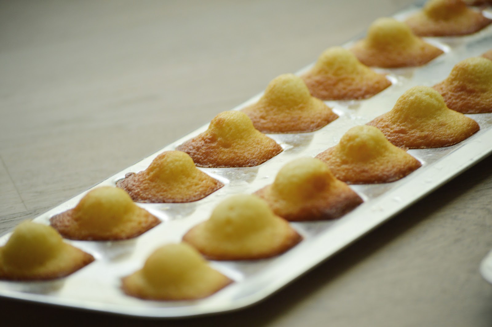 preheat the oven to 180 c / 350 f. brush the madeleine pans with melted butter, thoroughly, then chill the molds in the fridge to harden the butter. use a spoon to transfer the batter into the molds (i used about 1 tsp. of batter for each mold). tap the bottom of the pan against the work surface to smooth the top of the batter. bake for about 6 (for the mini madeleines) to 8 minutes (for the large madeleines), until the tops are lightly browned and a skewer inserted in the center comes out clean. note: the bottoms of the madeleines will brown more quickly than the tops, so keep the tops on the lighter side. immediately unmold the madeleines and cool on a cooling rack. the madeleines are best the day they are baked, but they can be stored in a covered container for up to 1 day.