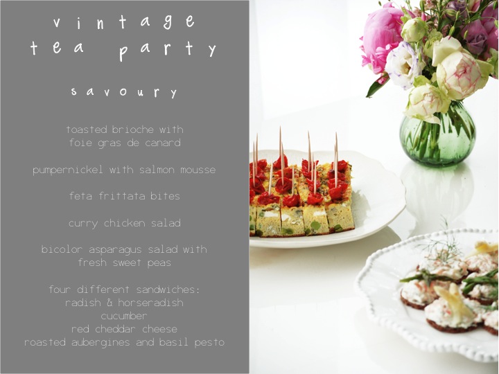 now some impressions from the vintage tea party supper club from last week. see the menu - sweet and savoury - above. of course, there was a selection of finest teas, too; earl greys and english breakfast and flavorsome green teas and rooiboshes... everything the english heart desires. it was a blast!