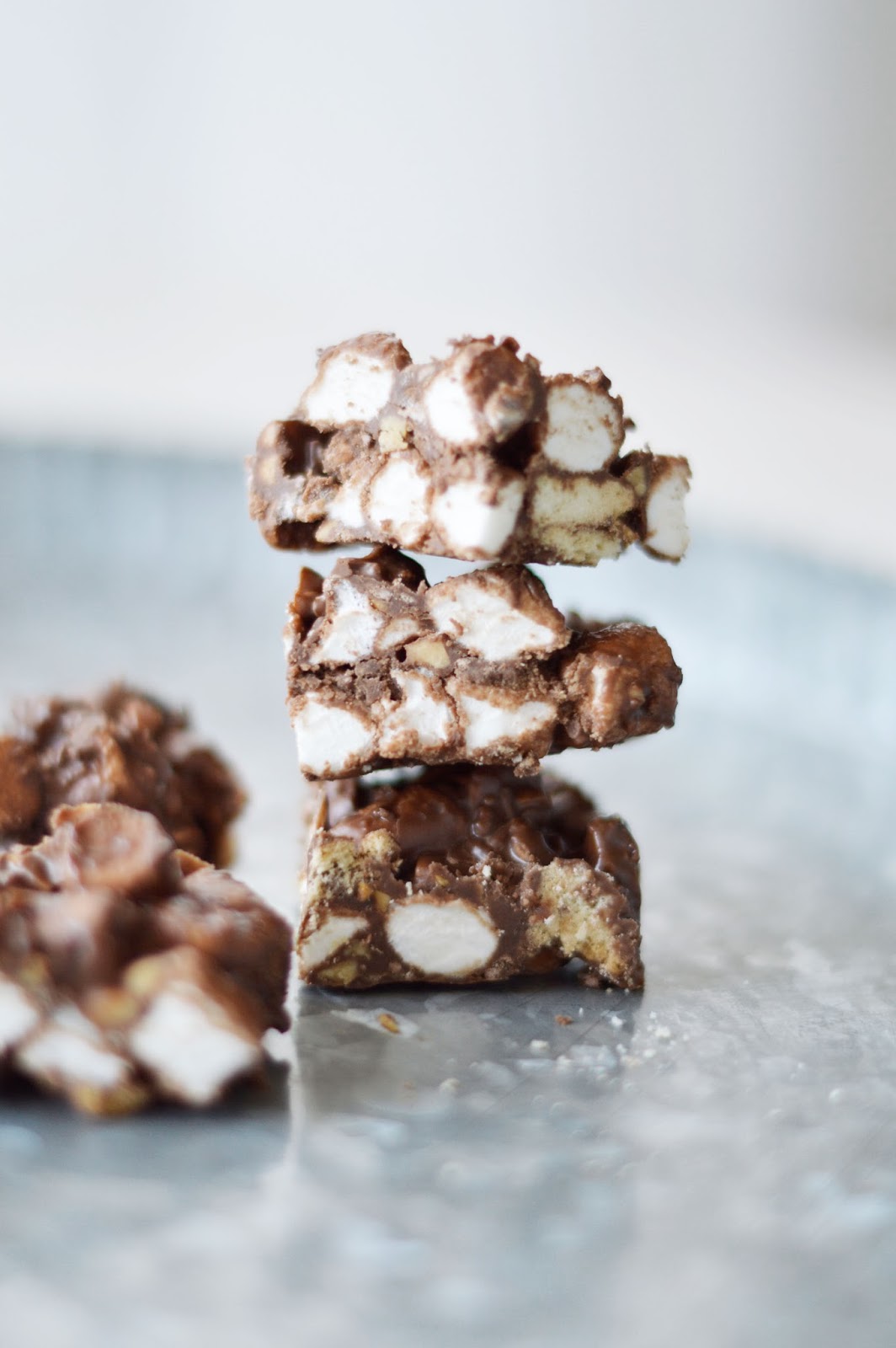 heat a large pot over very low heat and add peanut butter, butter and the chocolate chunks. constantly stir until totally melted - this will take about 10 minutes, but eventually everything will melt. remove from heat and set aside to cool for about 15-20 more minutes. this works best when the mixture is really completely cool, but not solid. then, fold in the marshmallows and cookies until evenly coated and distributed. line a baking pan with parchment, then spread the mixture into the pan, making sure to level out the top and to make the borders straight and smooth. let sit at room temperature for a few hours to firm up, or place in the fridge. when hardened, cut with a hot knife into 2x2cm sized cubes. store in the fridge in an airtight container for up to one week, but, i mean, eat them immediately, more likely.