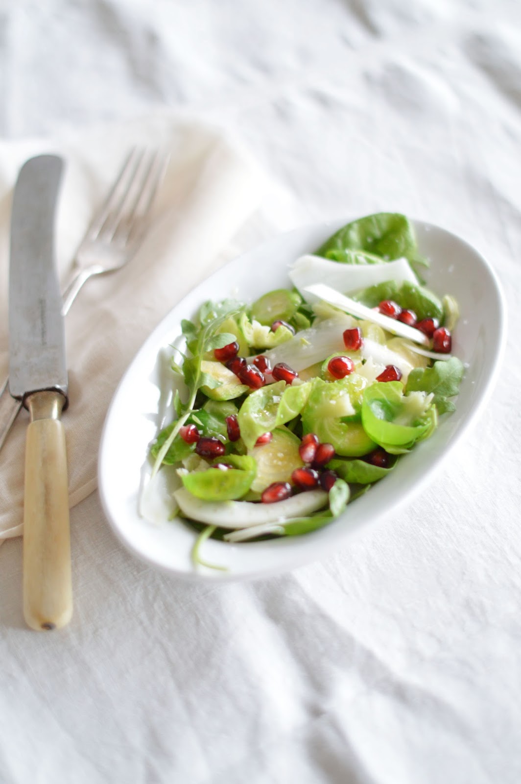 clean the brussels sprouts and remove the outer leaves. blanch in boiling water for 2 minutes, then drain and cool in ice cold water. peel off the leaves individually (as much as you can) - when it doesn't work well give in and finely slice. wash the spinach and rocket and pat dry. finely slice the fennel bulb. make a dressing with the lemon juice, olive oil, honey and salt. arrange greens on a plate (starting with the leafy ones), garnish with pomegranate aerils and sprinkle over the dressing.