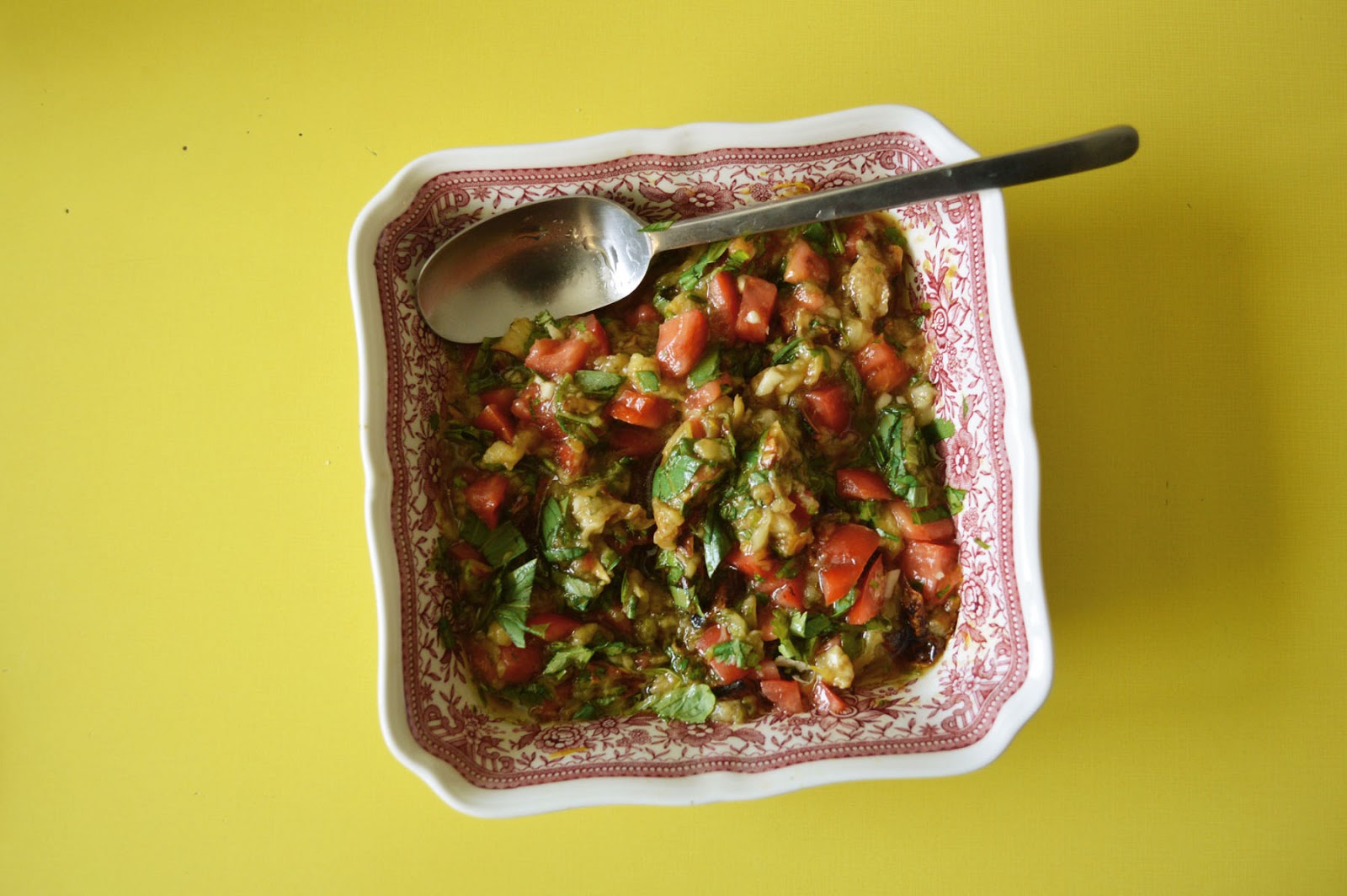 preheat the oven to a high heat and turn on the grill function (if available). put the aubergine halves on a pan, cut sides facing up, and brush with the olive oil. roast for about 25 to 30 minutes, until it's partially browned. let cool, then scratch out the flesh (a fork works just fine). in a bowl, combine all other ingredients to a simple, asian tasting dressing: sesame oil, soy sauce, honey, ginger, garlic and lime juice, then season with harissa and/or chili flakes to desired hotness and salt (only if needed, depends on your soy sauce, as mentioned above). combine the aubergine flesh, tomato cubes, cilantro and sesame, pour the dressing over it and serve.