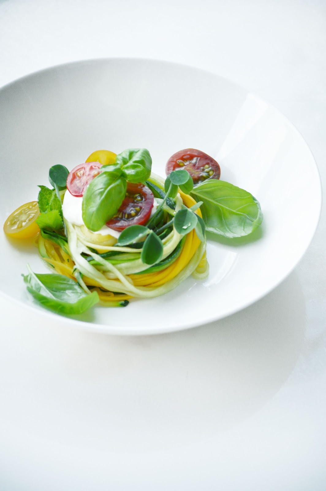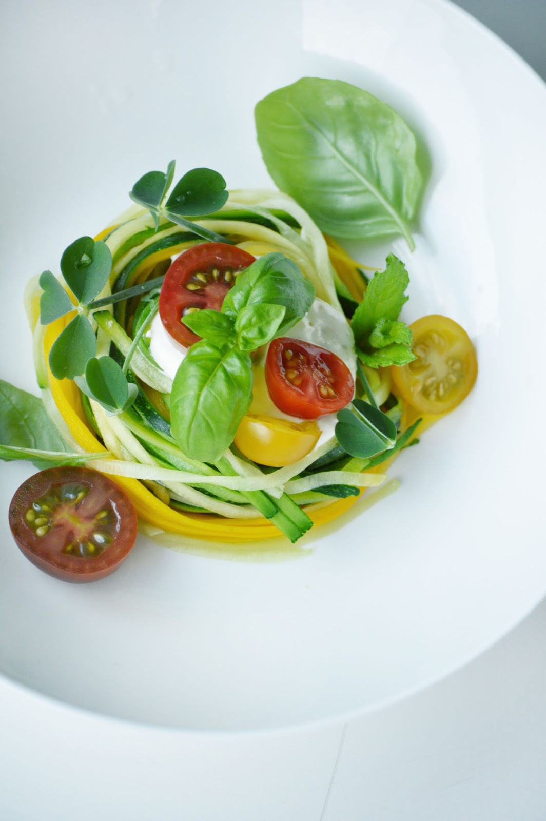 wash the zucchini, because you're going to use the peel, too. now slide a julienne peeler (yay, i've finally gotten myself one!) over the zucchini from one end to the other. the julienne peeler makes perfect, long, spaghetti-like stripes in one, easy swipe. of course, you can always cut it like that on your own, but it's exhausting for this amount. anyway, so proceed with the zucchini, until the first seeds appear (the seeds break the stripes so i leave them out). now rotate the zucchini 90 degrees and continue to peel it on this side. continue until all of the zucchini (except for the bit with the seeds) is peeled / julienned. heat a large saucepan with salted water, and quickly blanch the zuchini stripes in it (we're talking maybe 2 minutes here). drain them and cool them in the ice cold water. in the meantime, quickly heat the crème fraîche in a small saucepan, add the lemon juice and season with fleur de sel. arrange the zucchini stripes on a plate neatly (a fork works well to turn the 'pasta' into nice little nests), add a generous dollop of crème fraîche and decorate with tomato halves, basil leaves and mint leaves (note: i also added some leftover edible sour clover leaves, because they look so pretty, but i'm fully aware that most people don't happen to have clover on hand, so just skip it).