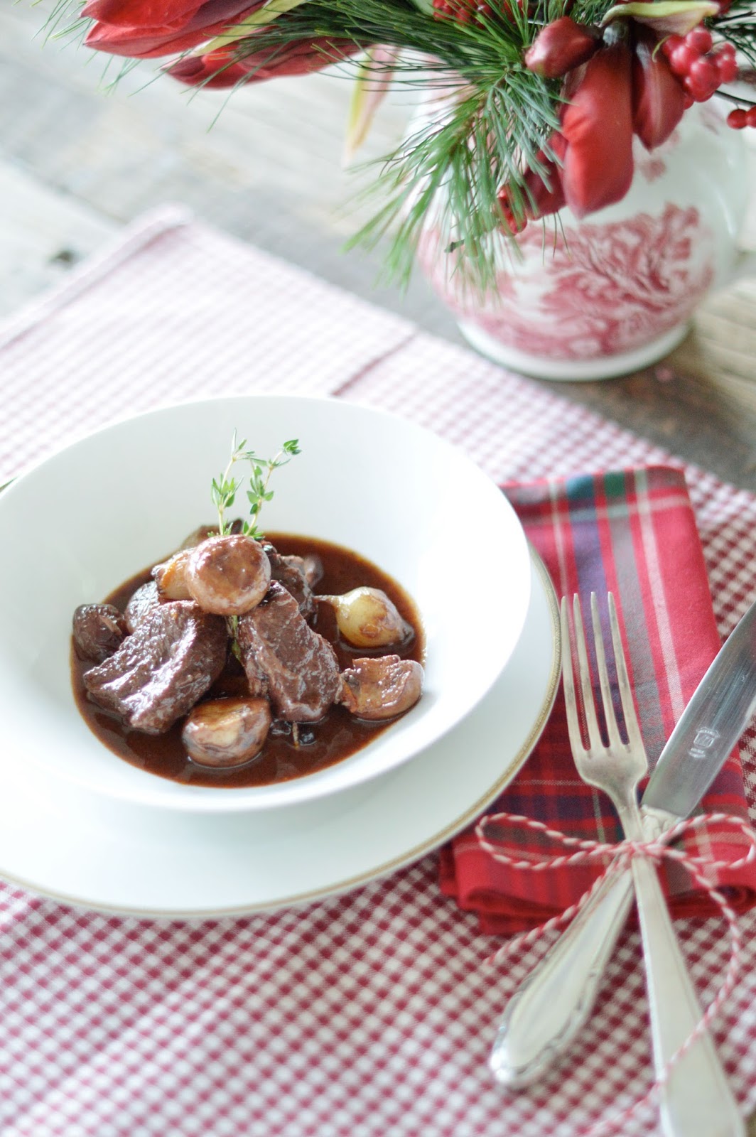 back to the meat: after the meat has braised long enough in the oven, remove the casserole. now you need to get rid of the vega and just keep the meat and the sauce. to do that, pick out every piece of meat with a pair of tongs; put aside. drain the rest, and catch the sauce with a large frying pan. discard the vegs. now let the red wine sauce reduce for and thicken for about 30 minutes. it needs to be thick enough to coat a spoon lightly. if too thin, boil it down rapidly. if too thick, mix in a few more tablespoons of stock. taste carefully for seasoning (after it's reudced). stir in some cold butter cubes for a nice glossiness. pour sauce back in the casserole over meat. add the fried onions and mushrooms. set aside until used; i.e. you can prepare everything ahead up to here! yay!