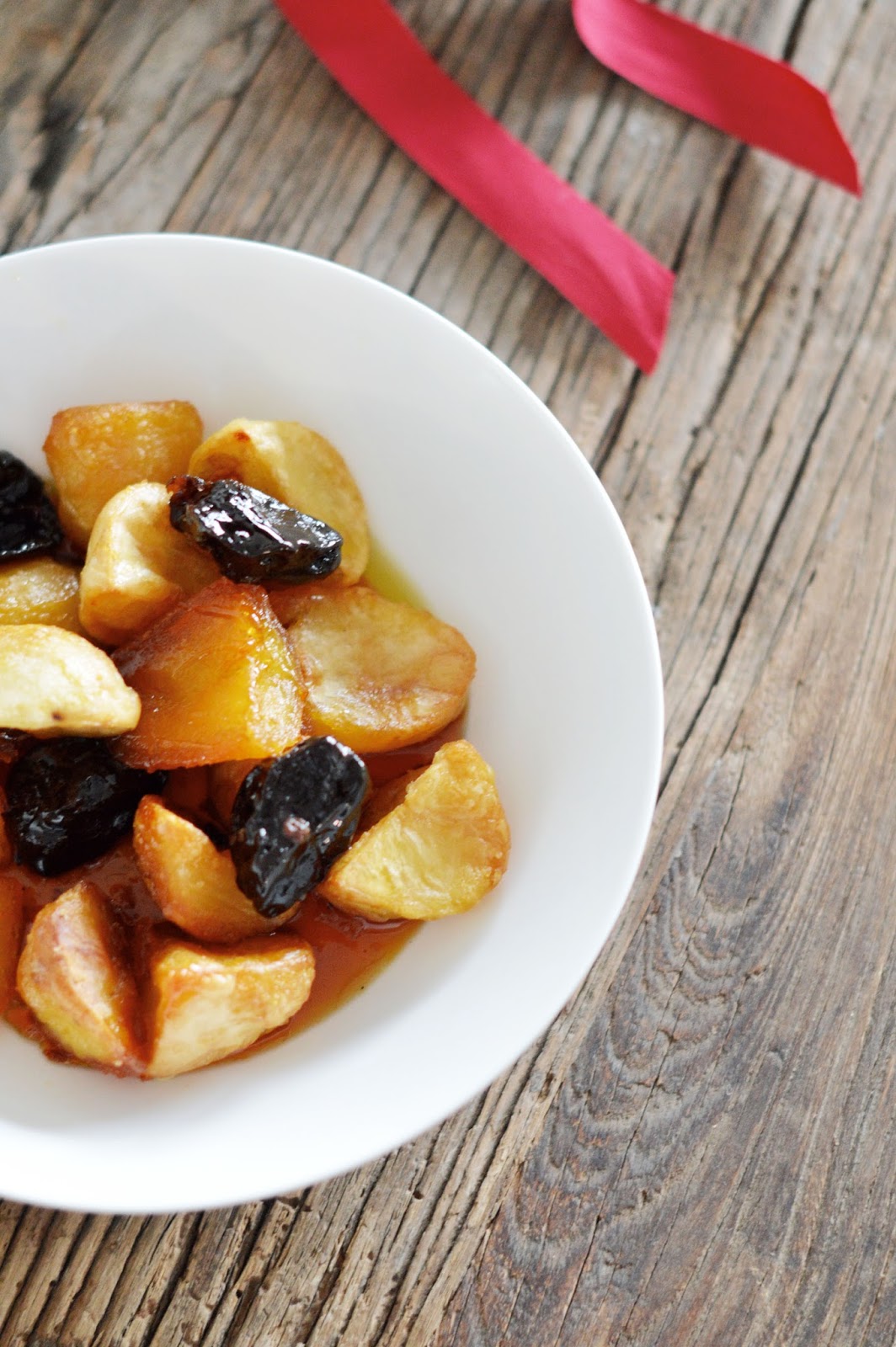 during this time, make the caramel. put the sugar in a heavy-based pan and place over a low heat. without stirring, watch the sugar as it turns a rich, caramel colour. keep your eyes on the sugar at all times because it can easily catch and burn. the moment it reaches the desired colour, remove from the heat. quickly pour the water into the caramel to stop it from cooking any more, then return to the heat and stir to eliminate any lumps (this is annoying, as it might take more minutes than you would have thought). before serving, stir the caramel into the potatoes and prunes. transfer to a bowl or directly onto the plates and eat at once.