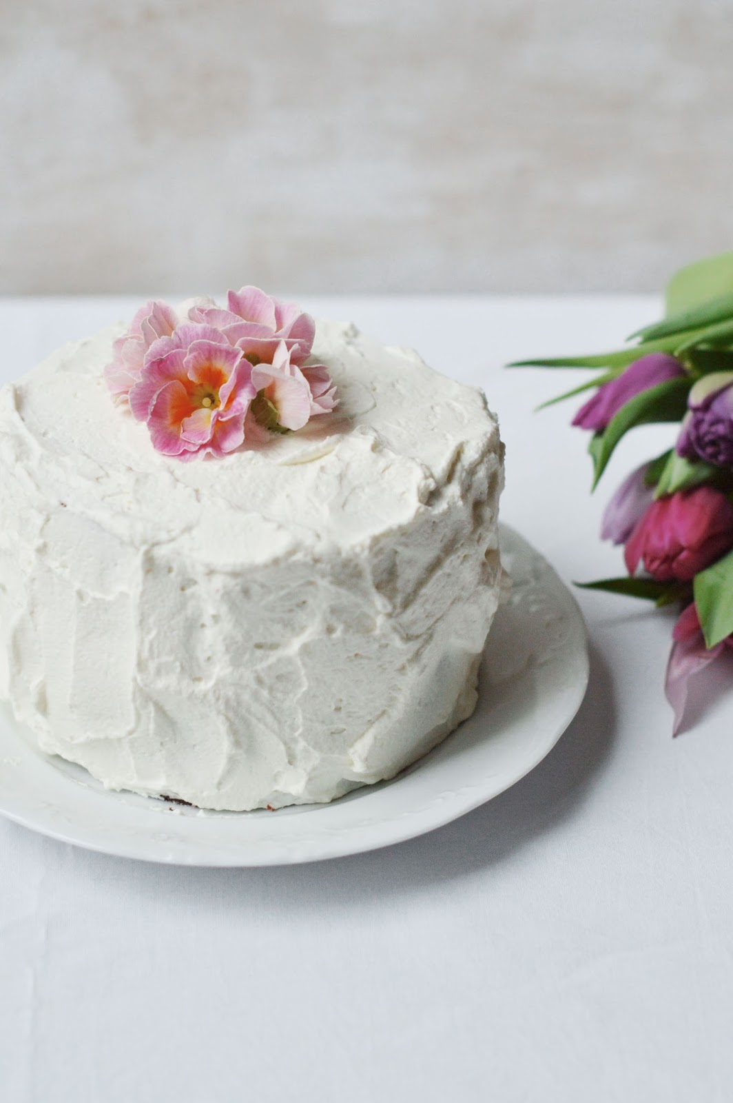 a friend's birthday a while back resulted in frenzied, last minute baking. i assured her i would bring a couple of things from my kitchen - including a tart tatin with beetroots. well, i made said tart. but let's just leave it at that: it wasn't very good. more like, maybe, a sandstorm. when i realised okay this tart is probably not going to be so great, i whipped up a cake at the last call (or even already after). a simple (very simple) chestnut cake. i divided the batter between two small, round cake pans, glued the layers together with some simple vanille whipped cream and frosted it with just the same. uhm, yeah, you've probably seen prettier cakes, right? at least, the inside didn't disappoint. it was moist and chestnutty and simply rustic - in a comforting way. and, you've got to give them some credit - the tulips are nice? period.