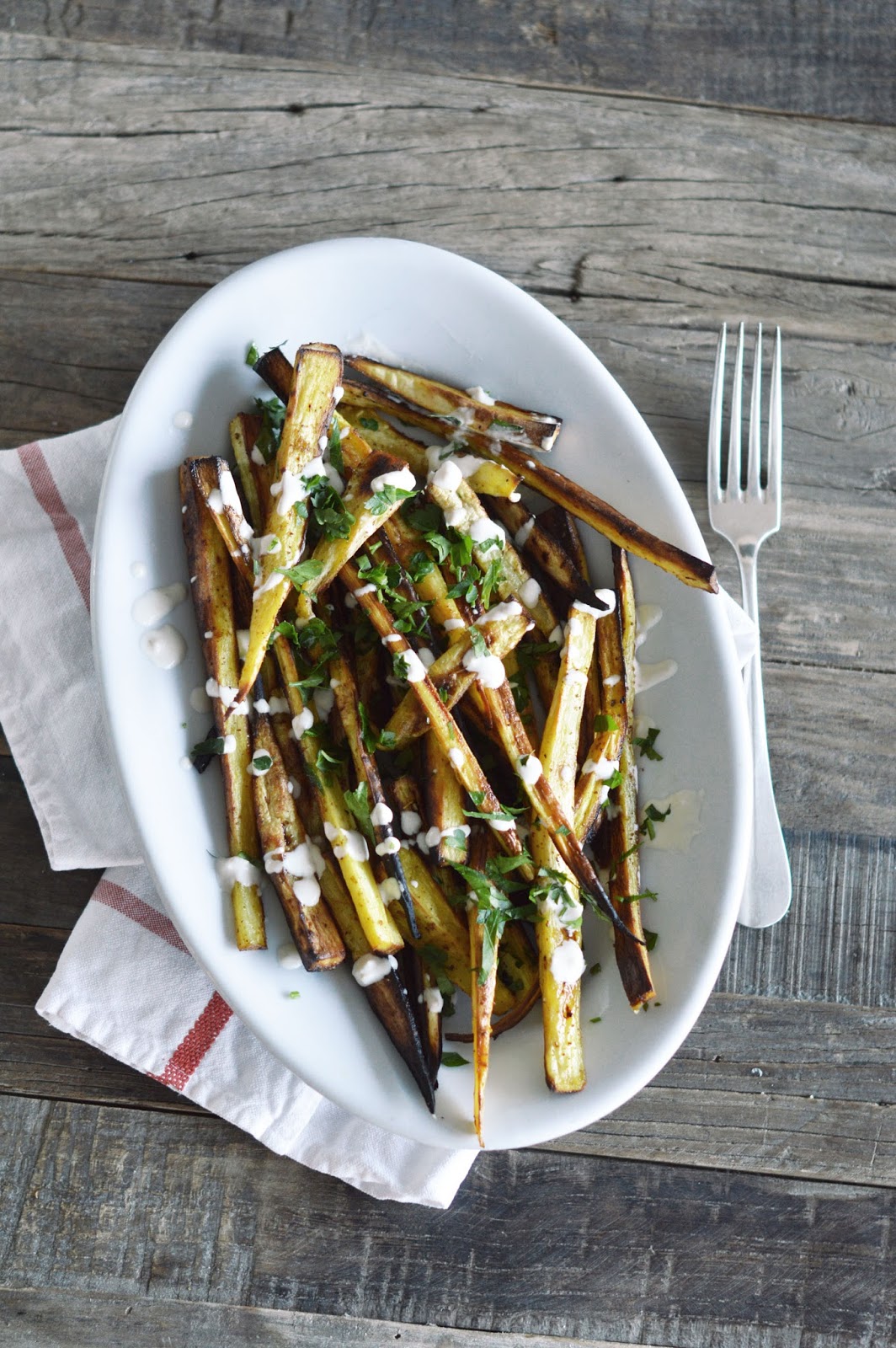 slice the parsnips lengthwise and cut them into equally (or as equally as possible) sized (about 1cm wide) batons / fries. coat with the olive oil and the cumin, season with salt and roast on a parchment paper in the oven (220c / 420 f) for about 25 to 30 minutes, until crispy. turn once, halfway through. remove and arrange on a plate. in the meantime prepare a dressing with the tahini, warm water and lemon juice. add the garlic and season with maldon sea salt. drizzle over the fries, then scatter the chopped parsley on top.