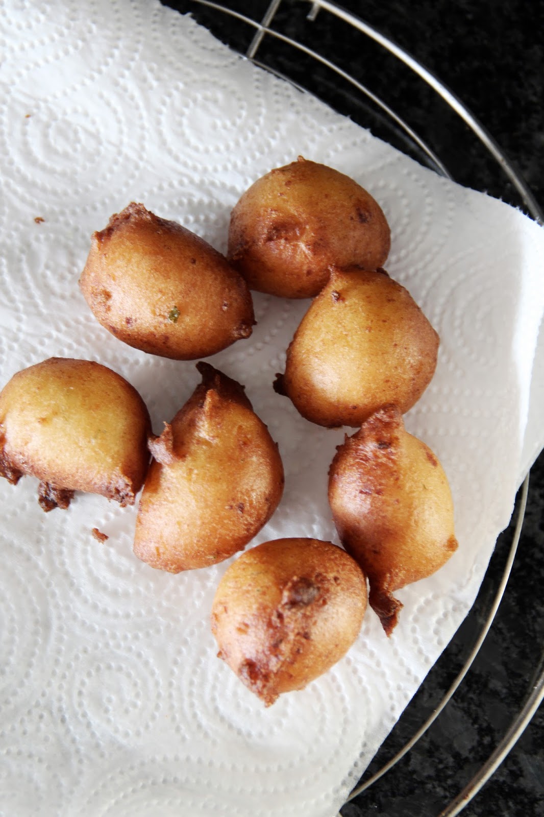 in a small but steep saucepan, bring the oil to a boil (or shortly before a boil, actually). make the bread crumb test: when a bread crumb sizzles enough when submerged in the oil, the oil is at the perfect heat for deep frying. keep it on medium heat then. now shape the fritters, using two teaspoons. release them carefully into the oil and fry for 3-4 minutes, occasionally turning them around, until golden brown. proceed in batches until all the dough is used up. remove fritters from the oil with a spider and put on kitchen paper to soak up excess oil.