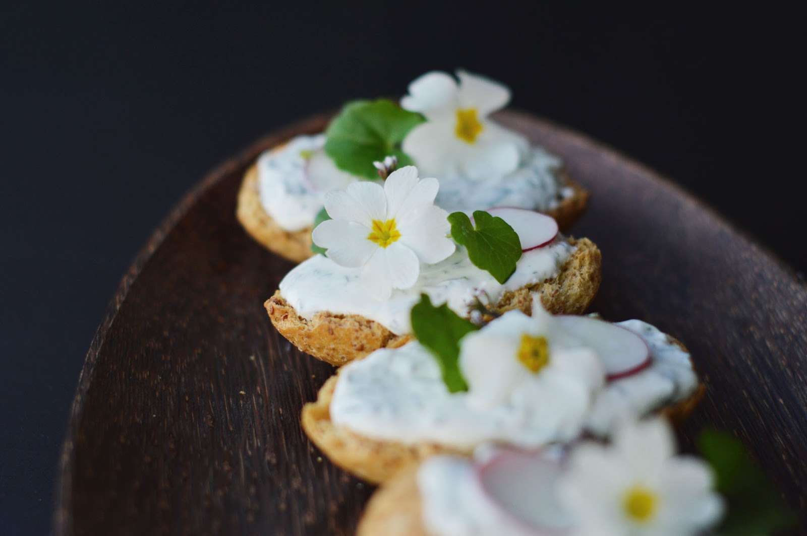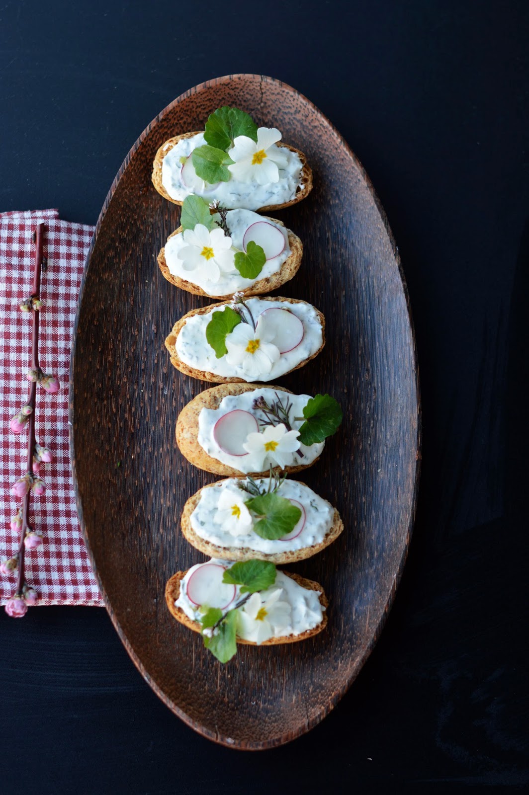 radish and blooms (i used lady's smock, daisies and primrose) for decoration