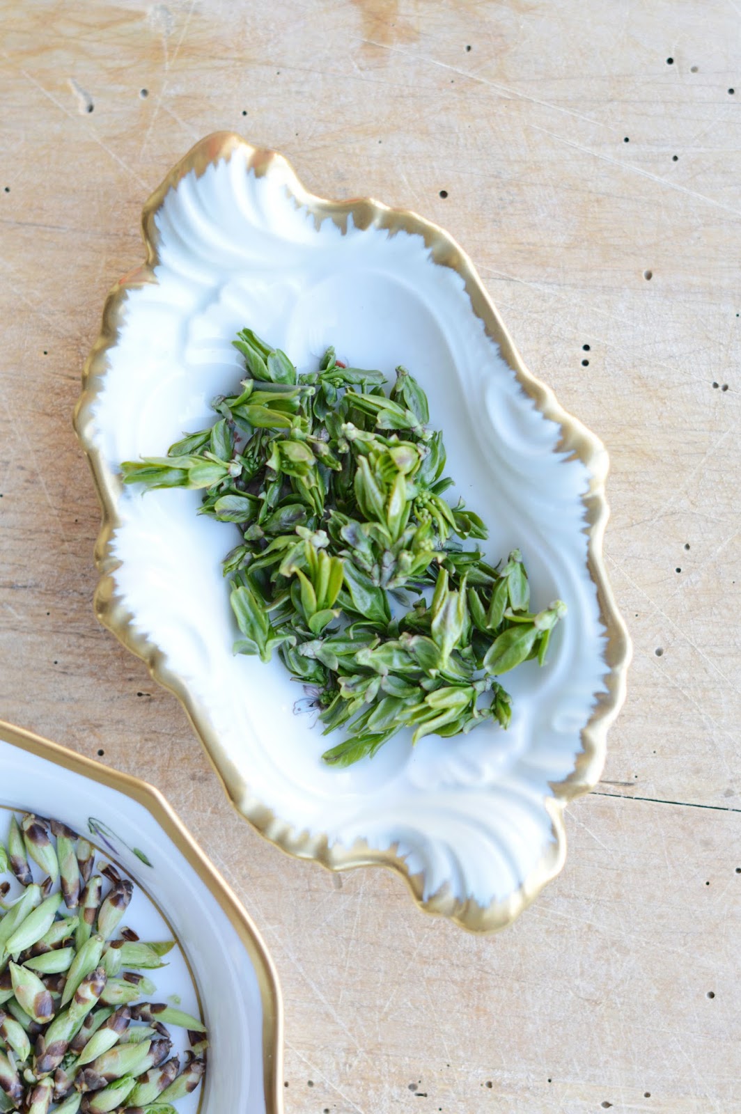 today, though, i'm more than happy to range the woods. in fact, i almost can not sit still at work when the sun is out. it pulls me towards the trees and meadows and fiels. to go and see what my friends wild galric, buds on trees, edible flowers and herbs do. every week, something new is out for us to discover. it is beautiful. but it puts me under so much pressure. a week without visiting the woods in spring is a waste. the differences and changes in the greens are incredible. it puts things into perspective. natures goes its course, no matter who's watching. so, i'm a bit stressed about the many (many!) posts i have in the pipeline for you, all starring precious wild herbs. the pictures sit on my computer and it freaks me out that every week they sit there means you get to see things that probably don't look the same anymore already at this stage of spring. some say i never really get around to blogging anymore, and that i'm not showing enough of the (millions?) of pictures i'm taking each time. where do they all end up? some ask (hi, mom!). well, i'm doing best i can. here's another, wild herbs included.