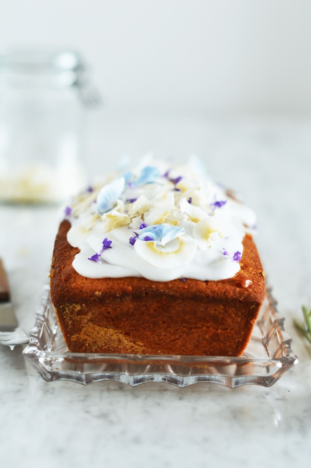 preheat the oven to 180 c / 350 f. grease and flour a loaf pan. in a bowl, combine the melted (not hot but cooled down a little) coconut oil, sugar and eggs. add the coconut milk. in another bowl, combine flour, baking powder and salt. work in the liquid mixture until a homogenous dough forms. fold in the coconut flakes. pour the mixture into the prepared pan. bake in the middle of the oven for 50 to 60 minutes, or until a stick inserted comes out clean. let cool a little, then turn out onto a rack to cool completely. when cool, whisk together the glaze with the coconut milk and the confectioners' sugar. spread onto the cake and scatter with coconut flakes and flowers.