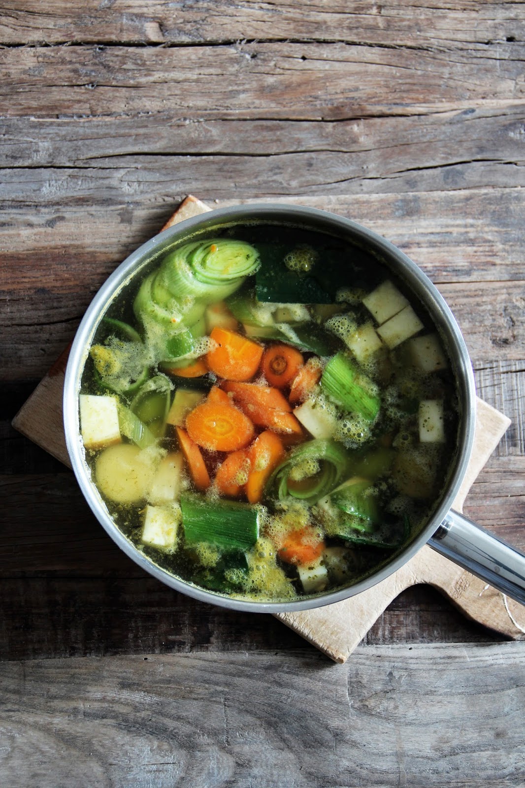 for the broth, coarsely chop all the vegs and bring to a simmer in about 2 liters of water. let cook on medium heat for about one hour. drain, pour back in the pan and season with salt (and/or some vegetable bouillon). keep warm.
