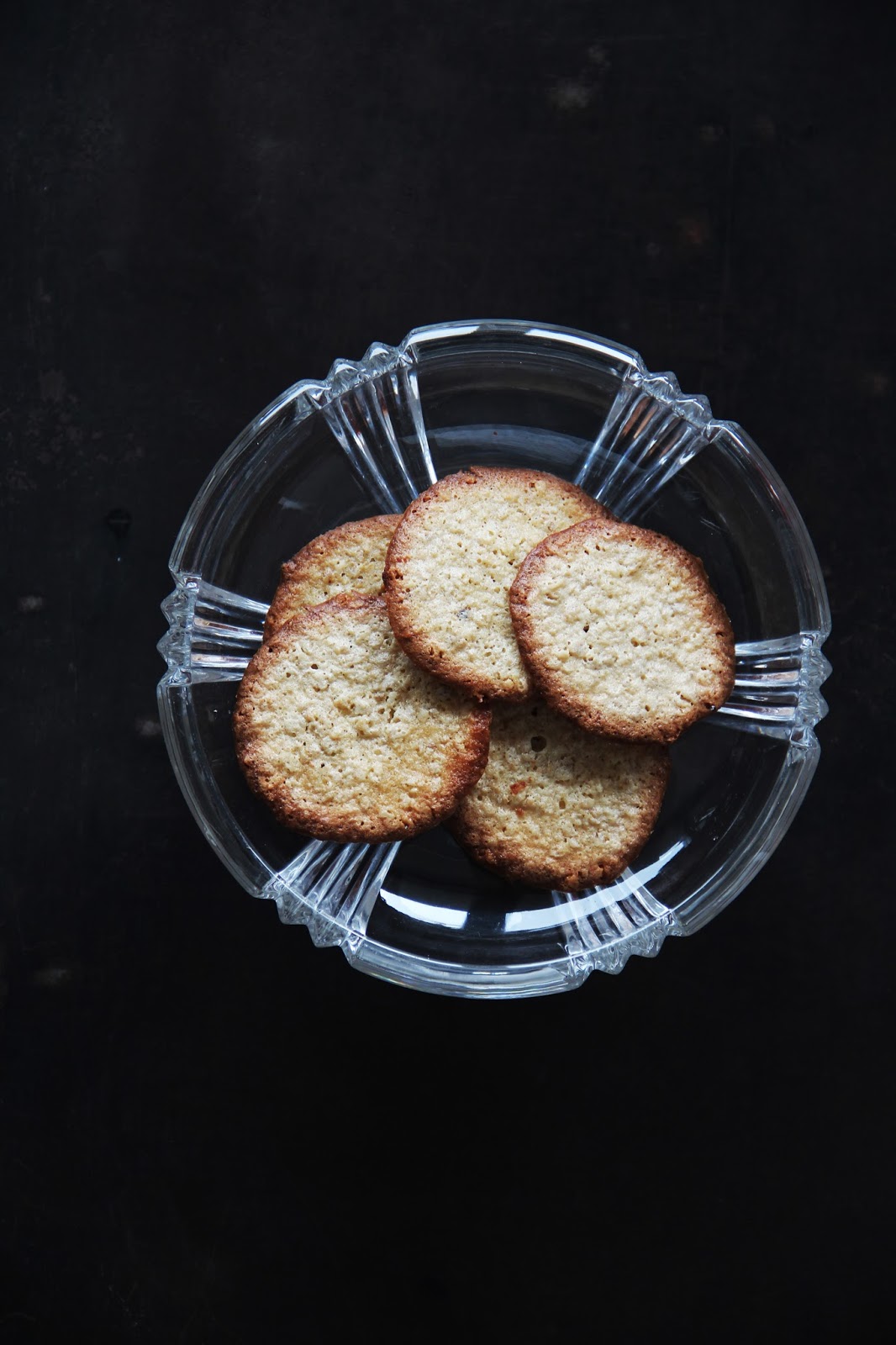 combine the oats with the melted butter, sugar and honey in a bowl. cover and let sit overnight (or at least for a couple of hours) at room temperature. add the eggs and stir to combine with a handmixer. ladle about 1/2 teaspoon of the mixture onto a baking sheet line with parchment. bake at 200 c / 400 for 3-4 minutes or until golden and crispy. let cool completely before removing from the pan. store on a plate and not in a tin or tupper wear, as the cookies might turn mushy.