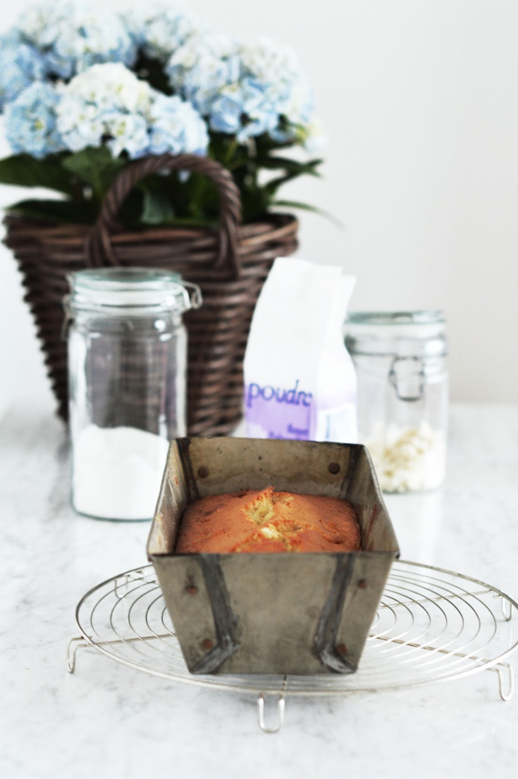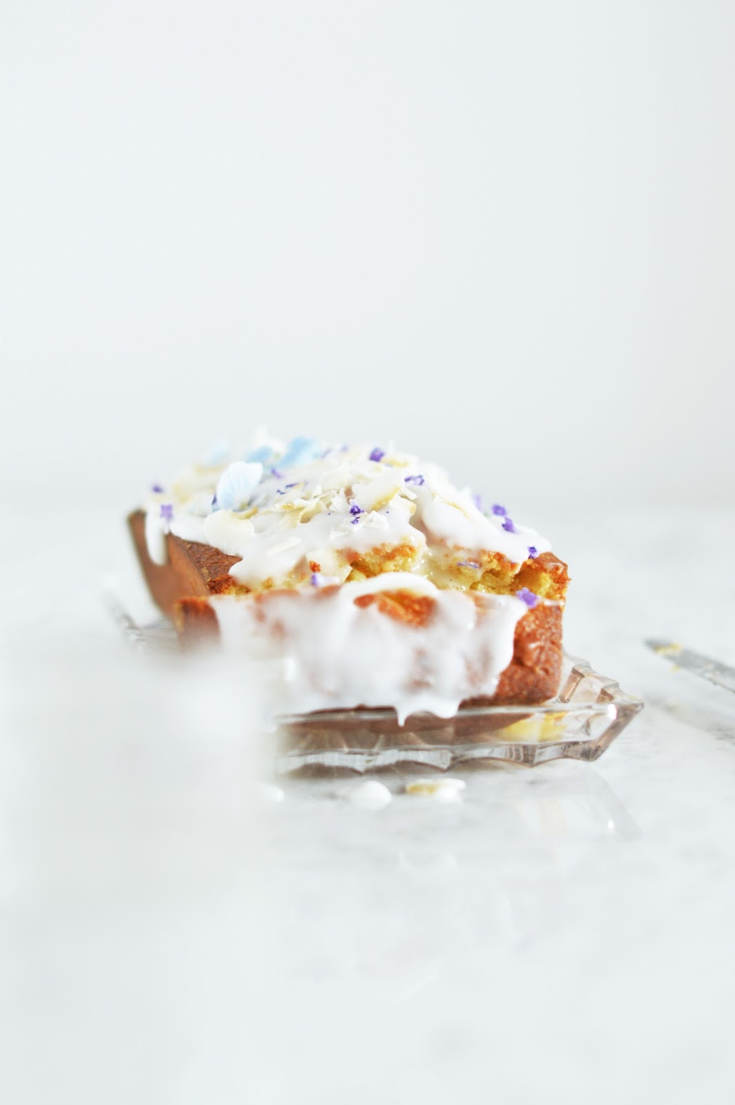 Preheat the oven to 180 c / 350 f. Grease and flour a loaf pan. In a bowl, combine the melted (not hot but cooled down a little) coconut oil, sugar and eggs. Add the coconut milk. In another bowl, combine flour, baking powder and salt. Work in the liquid mixture until a homogenous dough forms. Fold in the coconut flakes. Pour the mixture into the prepared pan. Bake in the middle of the oven for 50 to 60 minutes, or until a stick inserted comes out clean. Let cool a little, then turn out onto a rack to cool completely. When cool, whisk together the glaze with the coconut milk and the confectioners’ sugar. Spread onto the cake and scatter with coconut flakes and flowers.