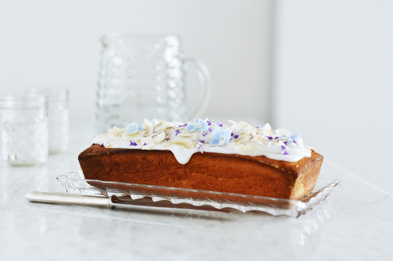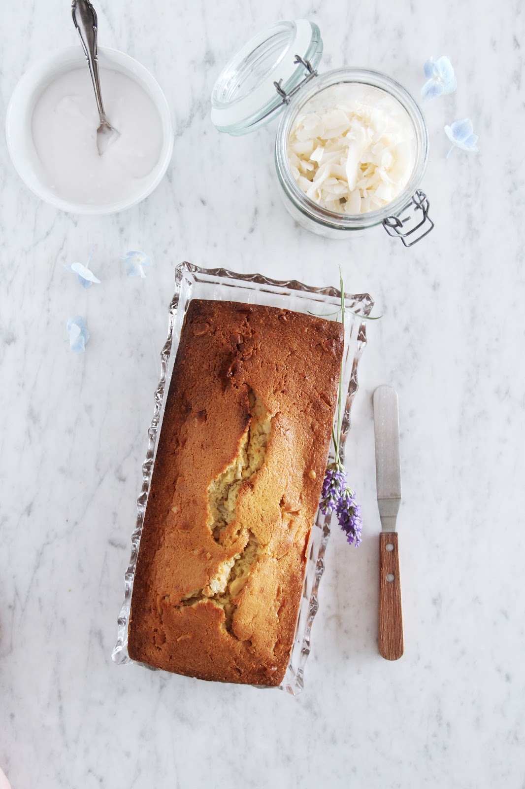 Preheat the oven to 180 c / 350 f. Grease and flour a loaf pan. In a bowl, combine the melted (not hot but cooled down a little) coconut oil, sugar and eggs. Add the coconut milk. In another bowl, combine flour, baking powder and salt. Work in the liquid mixture until a homogenous dough forms. Fold in the coconut flakes. Pour the mixture into the prepared pan. Bake in the middle of the oven for 50 to 60 minutes, or until a stick inserted comes out clean. Let cool a little, then turn out onto a rack to cool completely. When cool, whisk together the glaze with the coconut milk and the confectioners’ sugar. Spread onto the cake and scatter with coconut flakes and flowers.
